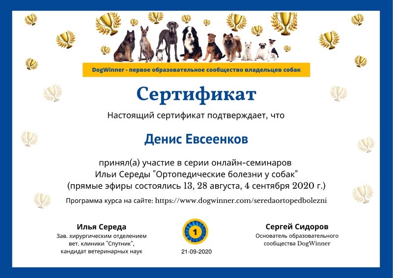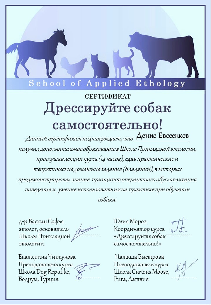 ЕВСЕЕНКОВ Денис /Кинолог, Зоопсихолог, Санкт-Петербург/ _____ Провожу индивидуальные консультации и тренировки: • Начальный курс послушания: основные команды, хождение на поводке, выдержка. • Социализация щенка: первые дни в доме, приучение к туалету, приучение к процедурам, приучение оставаться дома одному, приучение к амуниции, развивающие игры, как избежать укусов, алгоритм знакомства щенка с окружающими раздражителями (улица, люди, собаки и др.), неподбор на улице и многое другое. • Коррекция проблемного поведения: нечистоплотное поведение, чрезмерный лай, боязнь улицы, тревожность, фобии, боязнь одиночества, гиперактивность, погромы в квартире, агрессия к собакам, агрессия к людям, проблемы охраны ресурсов Мое отношение к собакам. Выбор моего образования был продиктован любовью к животным. Собаки занимают в моей жизни очень важную роль. Я считаю их уникальными творениями природы, которые живут рядом с нами уже много тысяч лет. Несмотря на это тесное и долгое сотрудничество, владельцы собак постоянно сталкиваются с ситуациями, которые заставляют их пересматривать свои взаимоотношения с питомцами. Часто люди выбирают очень некорректные, болезненные и неэффективные методы коррекции поведения, что только ухудшает взаимопонимание между собакой и владельцем. Моя цель – помочь понять собаку, найти оптимальные и эффективные алгоритмы решения проблемы. При этом ключевым моментом в отношениях между человеком и собакой должна быть не «война», а взаимовыручка и партнерство!